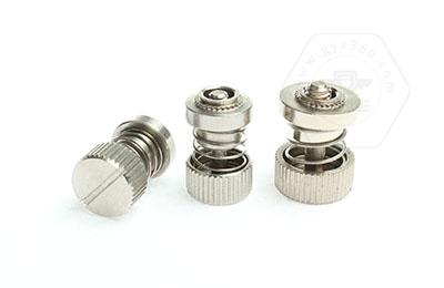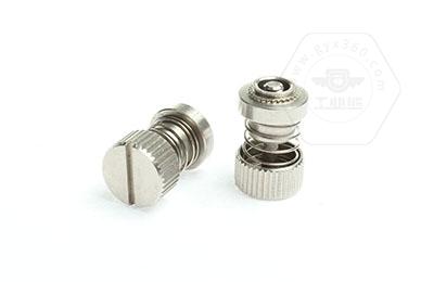 手緊螺釘?shù)膲恒T套具有壓花齒,壓裝于于機箱或薄鈑孔內(nèi)(注:薄板的鉆孔徑相對應彈簧螺釘?shù)膲糊X徑有一定要求的,形成一個外露的彈簧螺釘,用手擰另一端(即手擰端).因其里面固定有彈簧,螺釘相對于薄板的另一端來回進出。