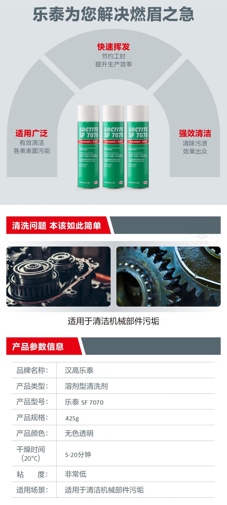 樂泰SF7070是一款溶劑型清洗劑。樂泰SF7070主打快速去污,適用于表面清潔和機械部件污垢清洗。樂泰SF7070無色透明,化學(xué)類型為碳?xì)浠衔铮?0℃下干燥時間為5-20分鐘,粘度非常低。樂泰SF7070具備快速揮發(fā)、應(yīng)用廣泛、強效清潔等特點,可用于裝配前的最終清潔處理。樂泰SF7070還與金屬、多種塑料和彈性體兼容。