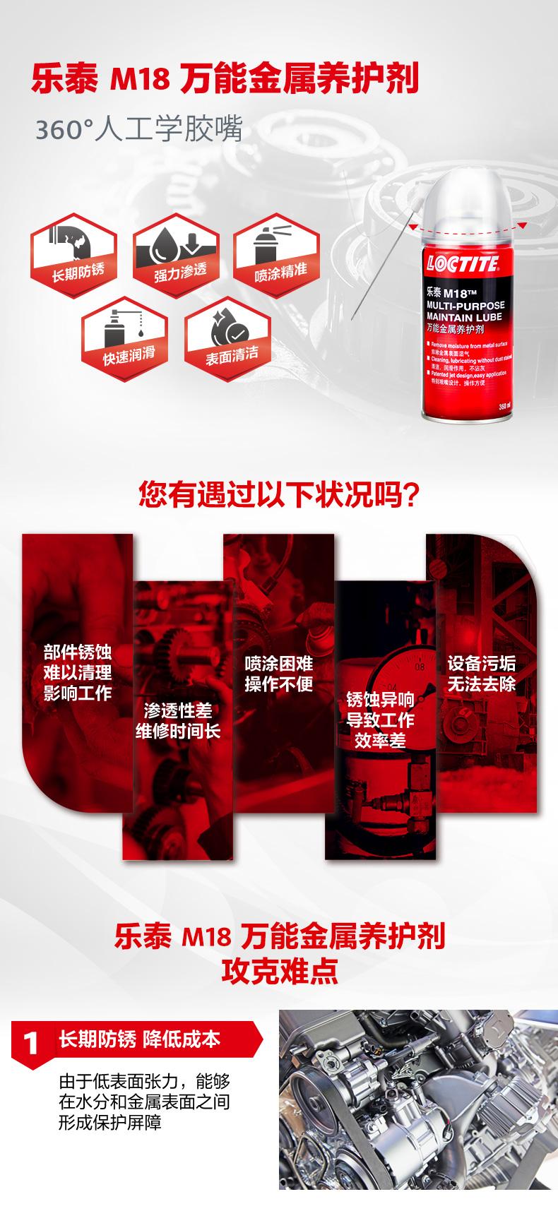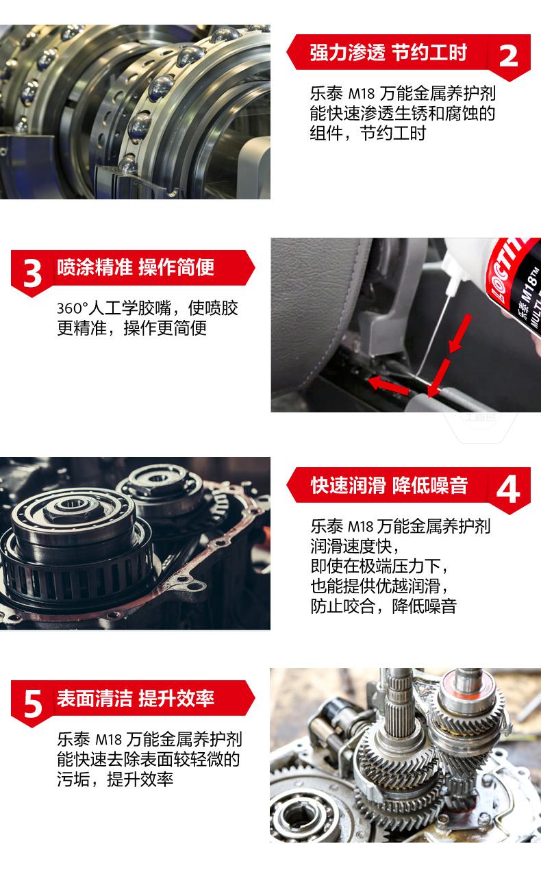 樂泰M18萬能金屬養(yǎng)護(hù)劑是一款集防銹、滲透、潤滑、清潔于一體的產(chǎn)品。樂泰M18萬能金屬養(yǎng)護(hù)劑由于低表面張力,能夠在水分和金屬表面之間形成保護(hù)屏障,實現(xiàn)長期防銹。樂泰M18萬能金屬養(yǎng)護(hù)劑可快速滲透生銹和腐蝕組件,節(jié)約工時。樂泰M18萬能金屬養(yǎng)護(hù)劑采用360°人工學(xué)膠嘴,噴涂更精準(zhǔn),操作更簡便,還可快速潤滑并降低噪音,同時去除表面較輕微污垢,提升效率。