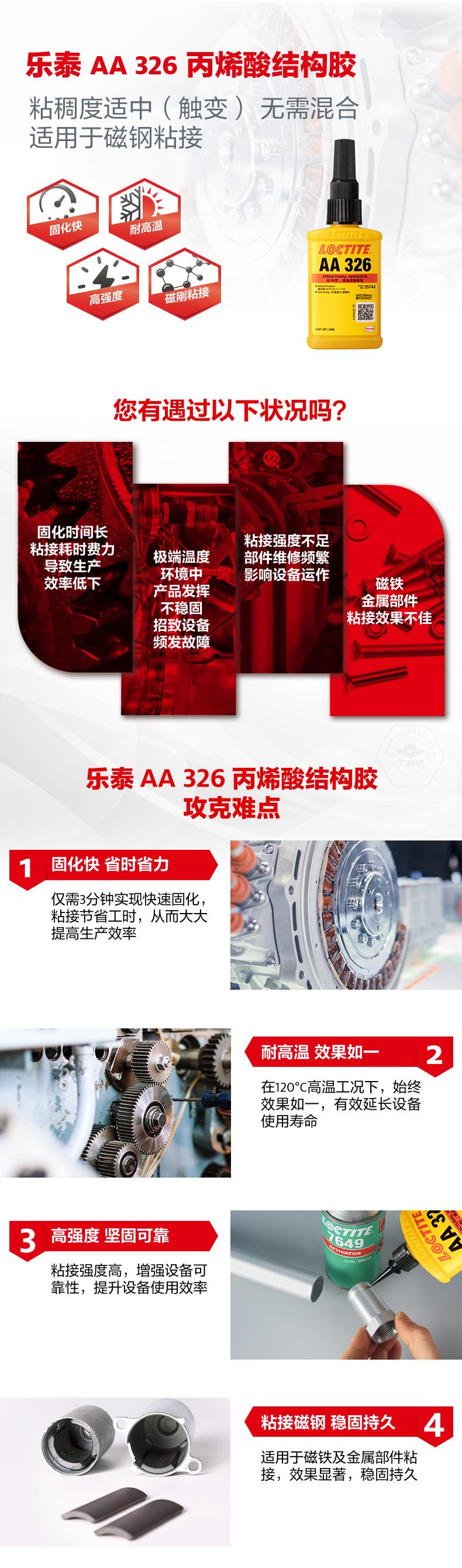 樂(lè)泰AA326丙烯酸結(jié)構(gòu)膠粘稠度適中(觸變),無(wú)需混合,適用于磁鋼及金屬部件粘接。樂(lè)泰AA326丙烯酸結(jié)構(gòu)膠僅需3分鐘即可快速固化,節(jié)省工時(shí)。樂(lè)泰AA326丙烯酸結(jié)構(gòu)膠在120℃高溫工況下效果如一,且具備高強(qiáng)度特點(diǎn)。樂(lè)泰AA326丙烯酸結(jié)構(gòu)膠主要用于將鐵氧體粘接到要求快速固定的電機(jī)定子或轉(zhuǎn)子上,也可用于揚(yáng)聲器零件和珠寶。